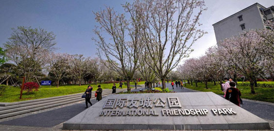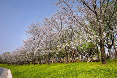 國(guó)際友成公園旁 / 原名櫻花公園,綠地蜿蜒郁郁蔥蔥,櫻花美景盛放在眼前